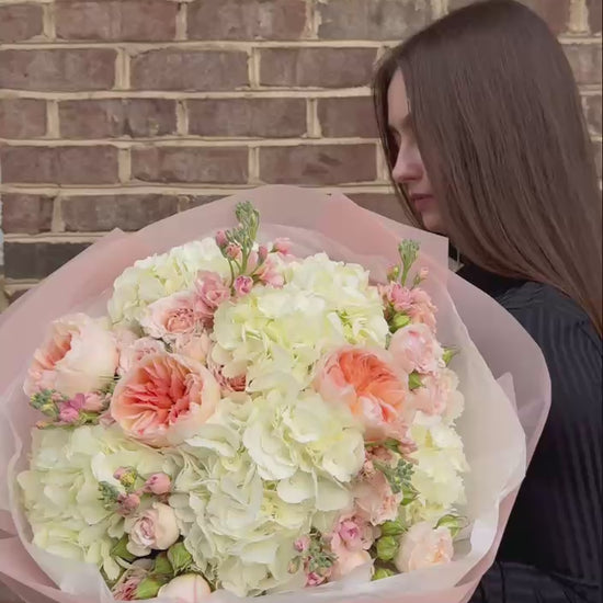 "Crème de Jardin" Creamy Bouquet of Hydrangeas, Garden Roses and Stock