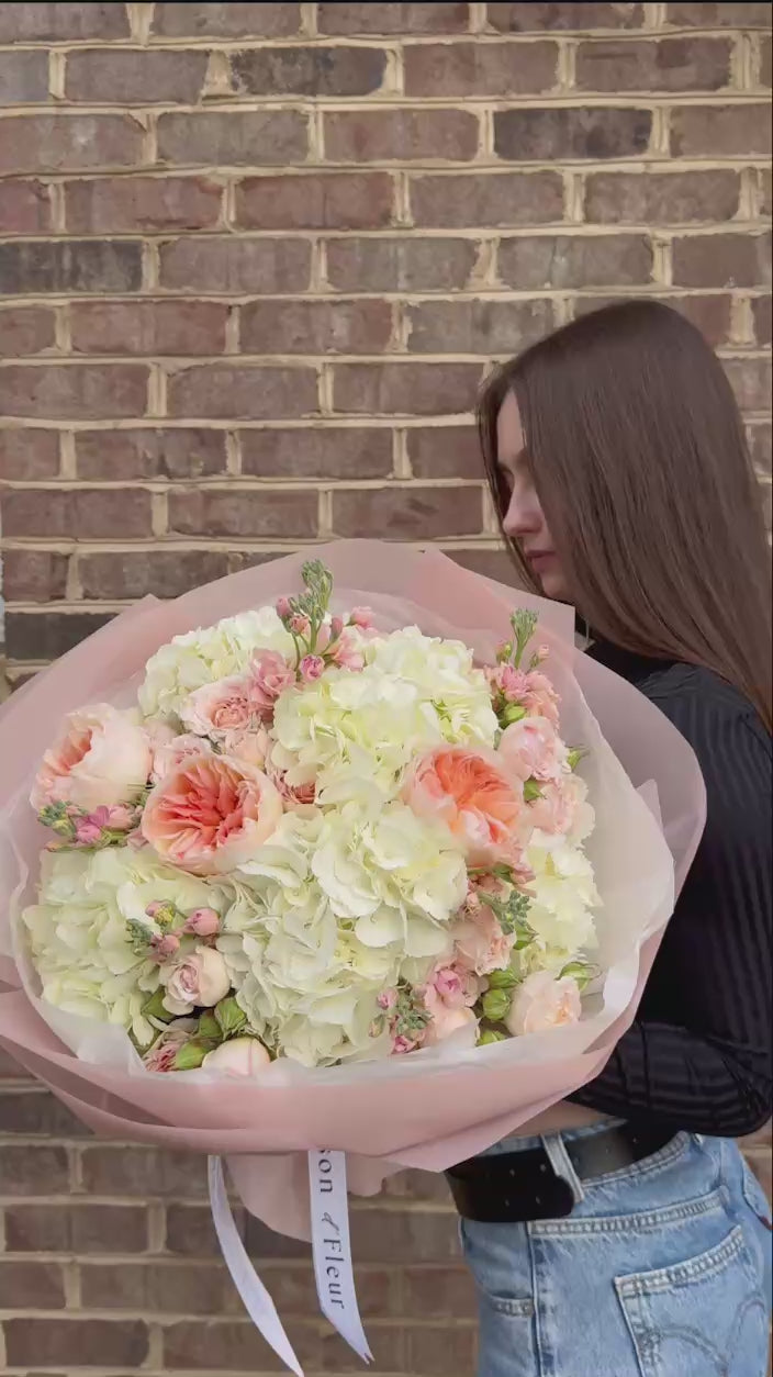 • Premium white hydrangeas, blush spray roses, fragrant stock (matthiola), and seasonal accent blooms