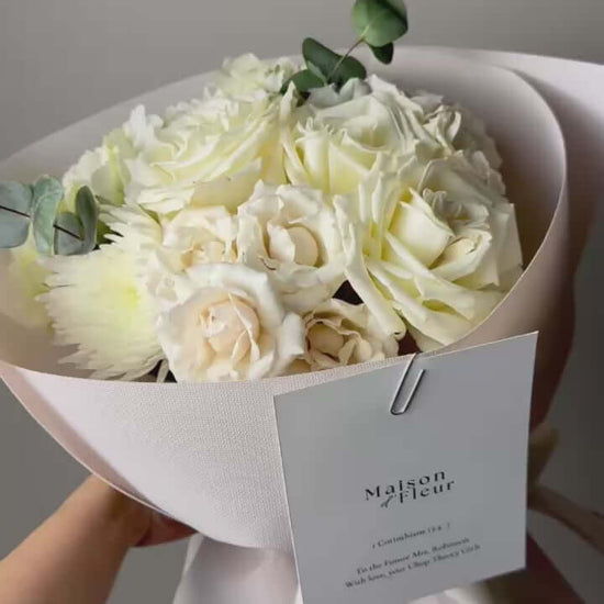 As timeless as moonlight and as serene as silence, Nuage de Vanille is a radiant arrangement of pure white hydrangea and roses, spray roses, chrysanthemum blooms, and textural eucalyptus. With soft folds, creamy undertones, and cloudlike fullness, this bouquet speaks in whispers—making it perfect for a new beginning, a peaceful goodbye, or simply to say “I’m here.”