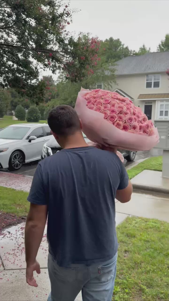 - 25 stems of premium Geraldine pink roses, known for their large heads and perfect formation