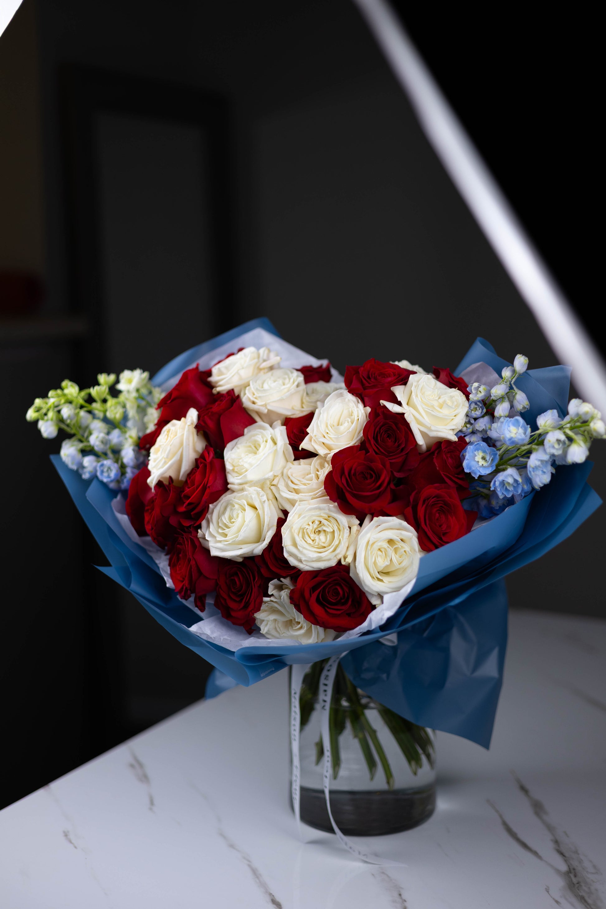 Featured: premium red and white roses with blue delphinium accents