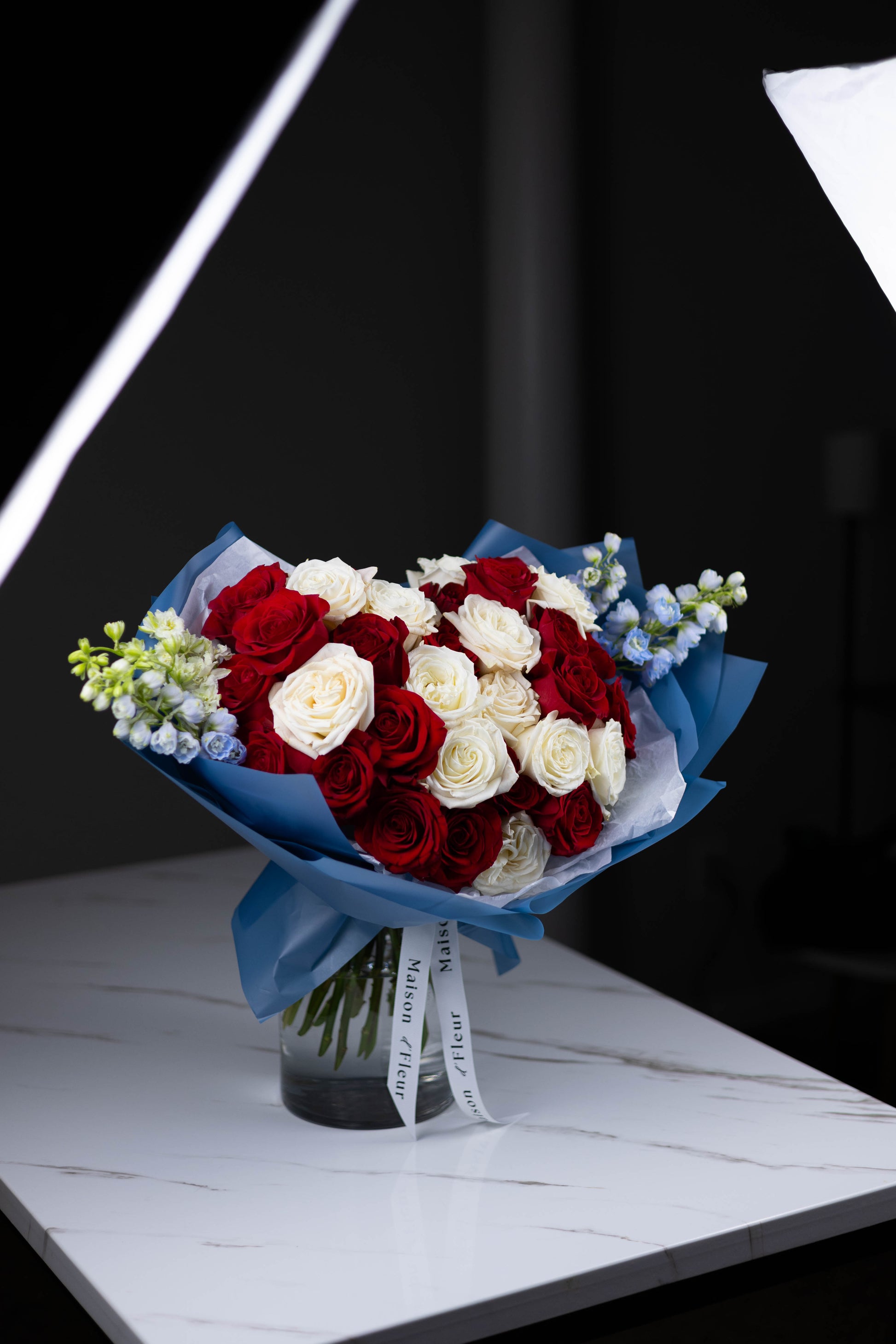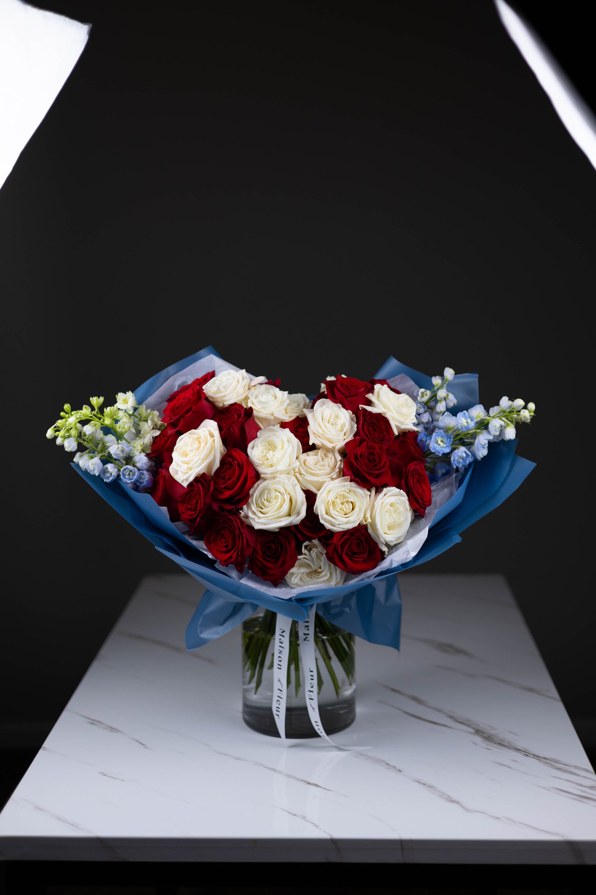 With timeless red and white roses at its heart, L’Héritage is a bold tribute to love, legacy, and loyalty. Creamy white garden roses and deep crimson blooms are artfully arranged in Maison d’Fleur’s signature hand-tied style, then softened with delicate blue delphinium and wrapped in elegant cobalt paper.