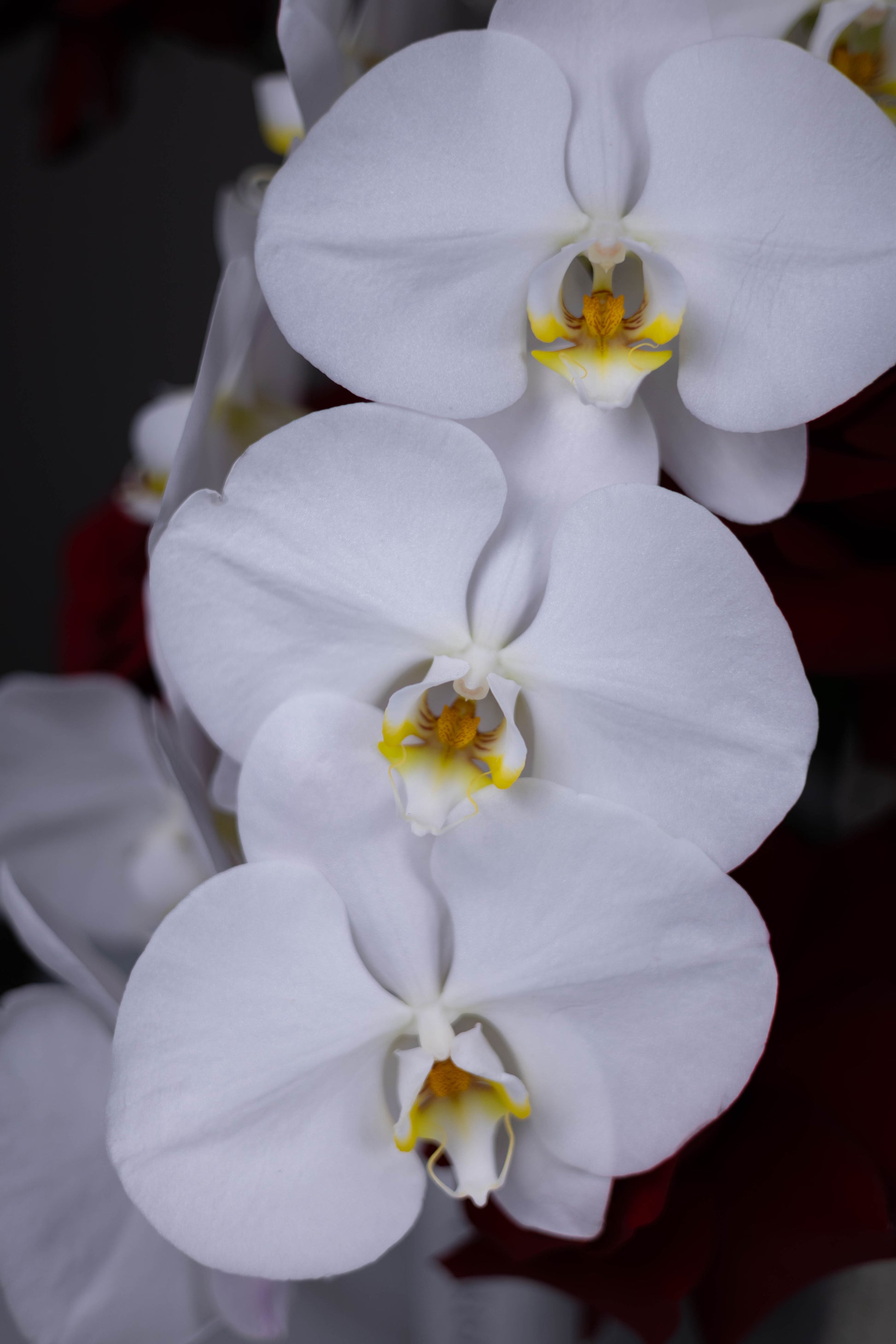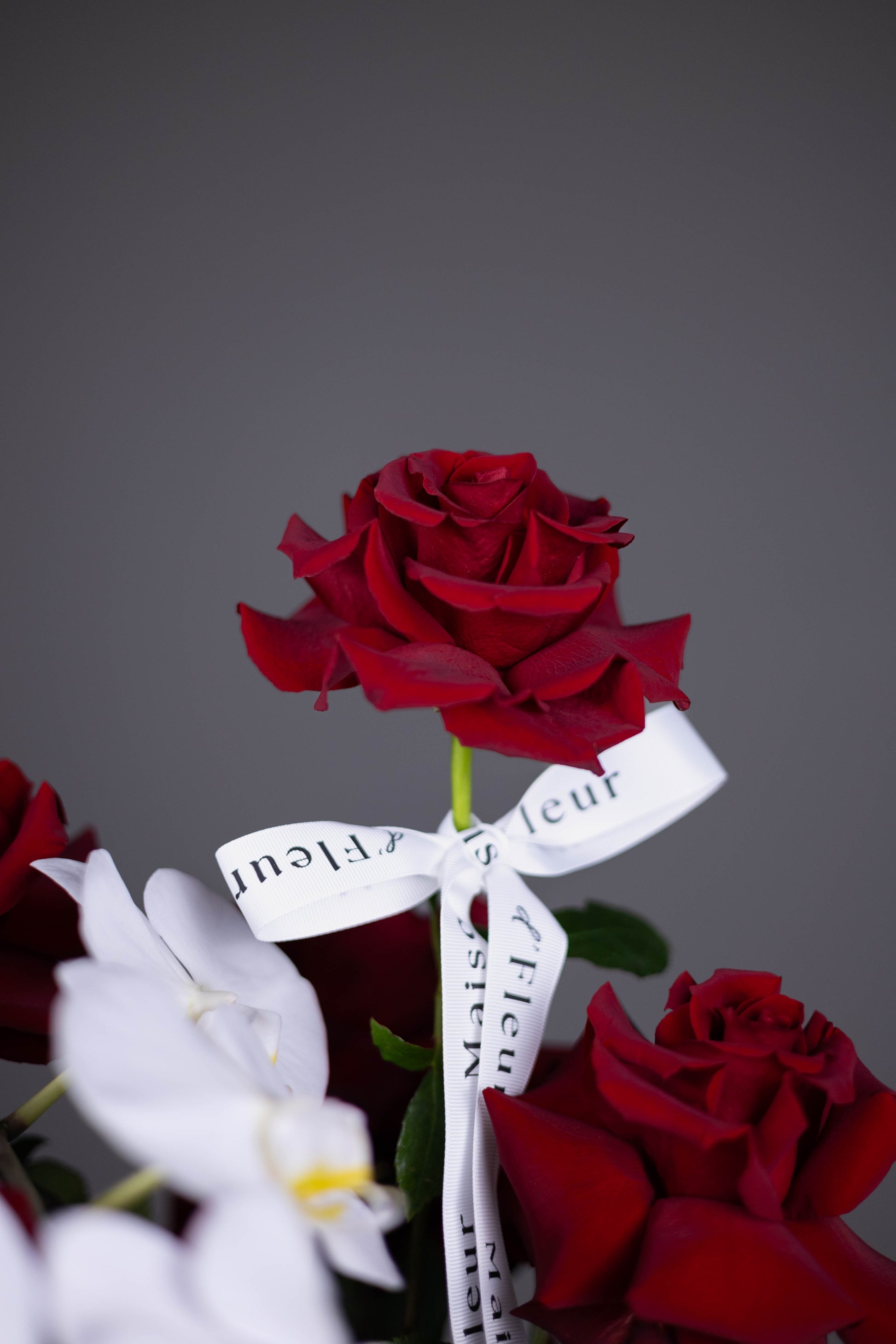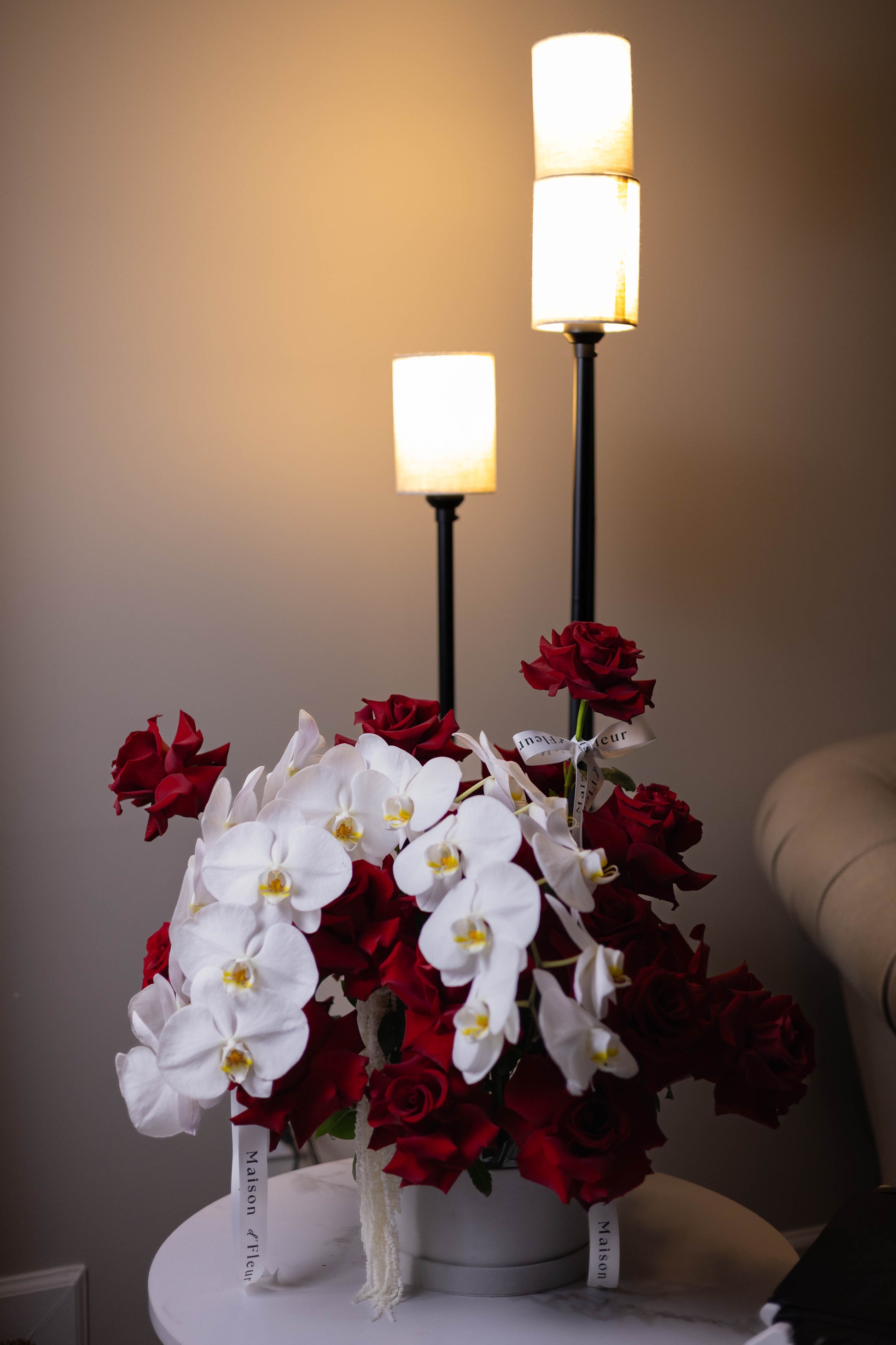 With all the grandeur of a royal opera, "La Reine Noire" commands the room. Ravishing red roses—symbols of passion and eternal love—are layered in lush abundance, while cascading white Phalaenopsis orchids lend a striking, sculptural elegance. The juxtaposition is intentional: a visual love letter to bold romance and high drama.