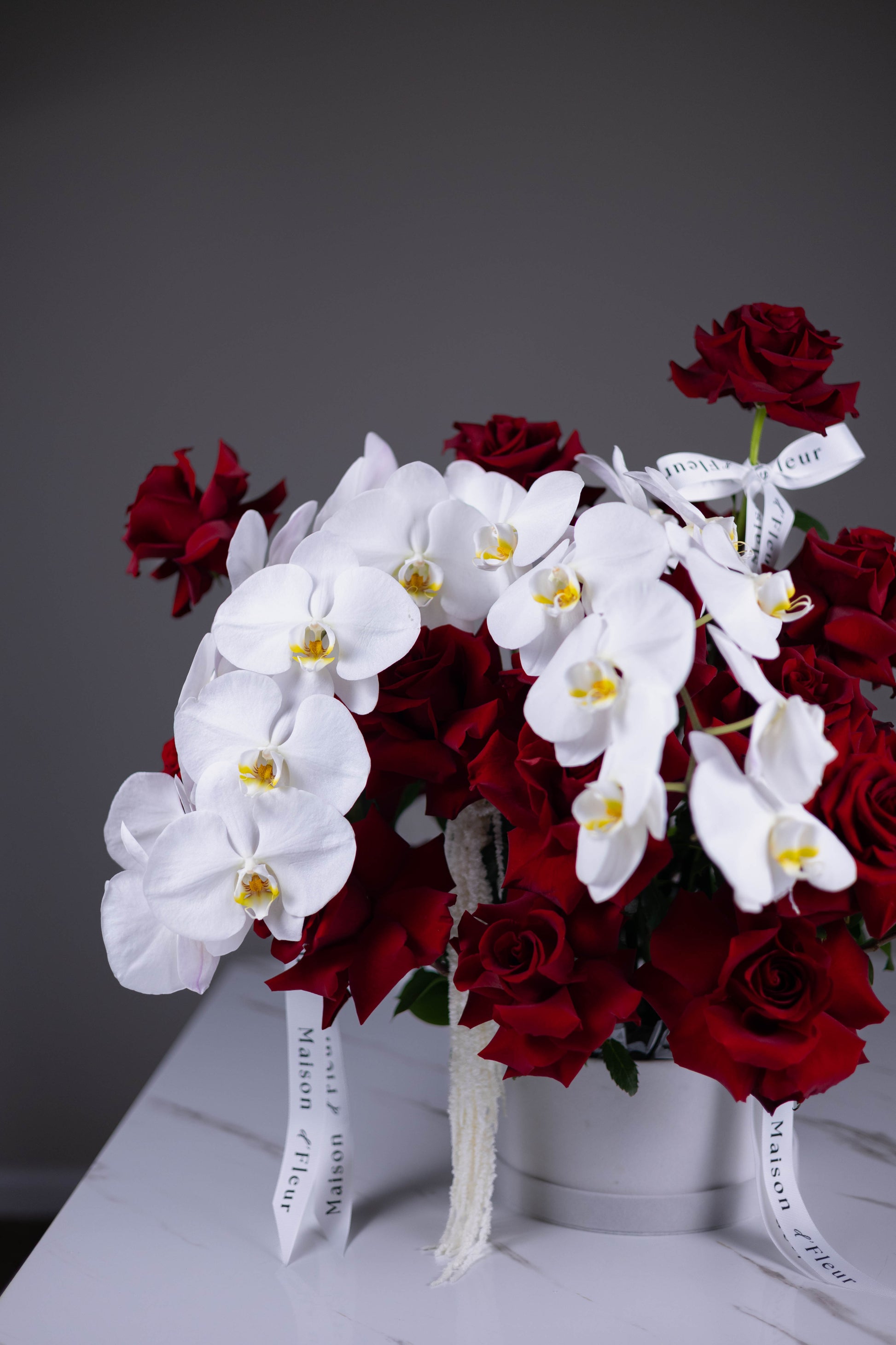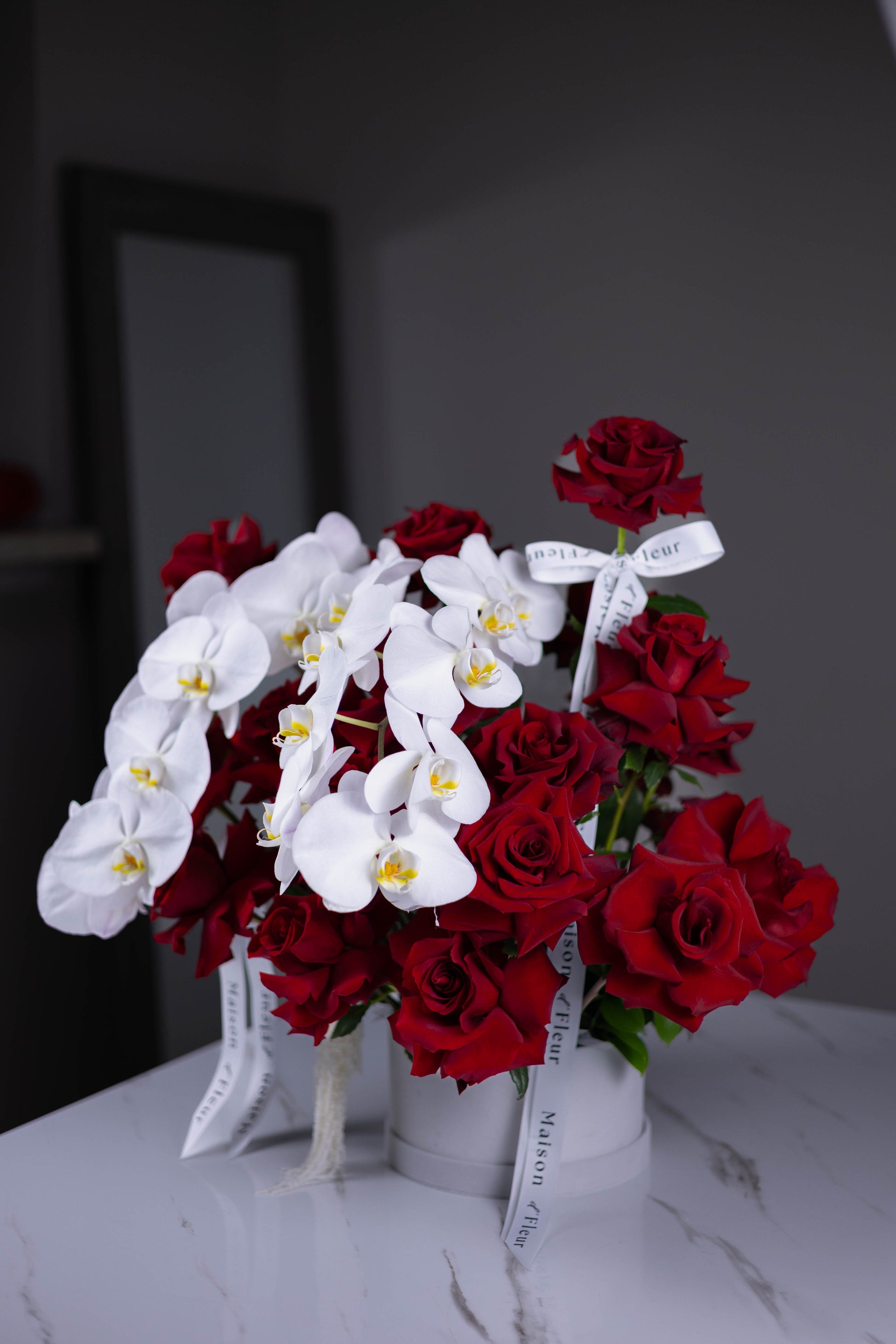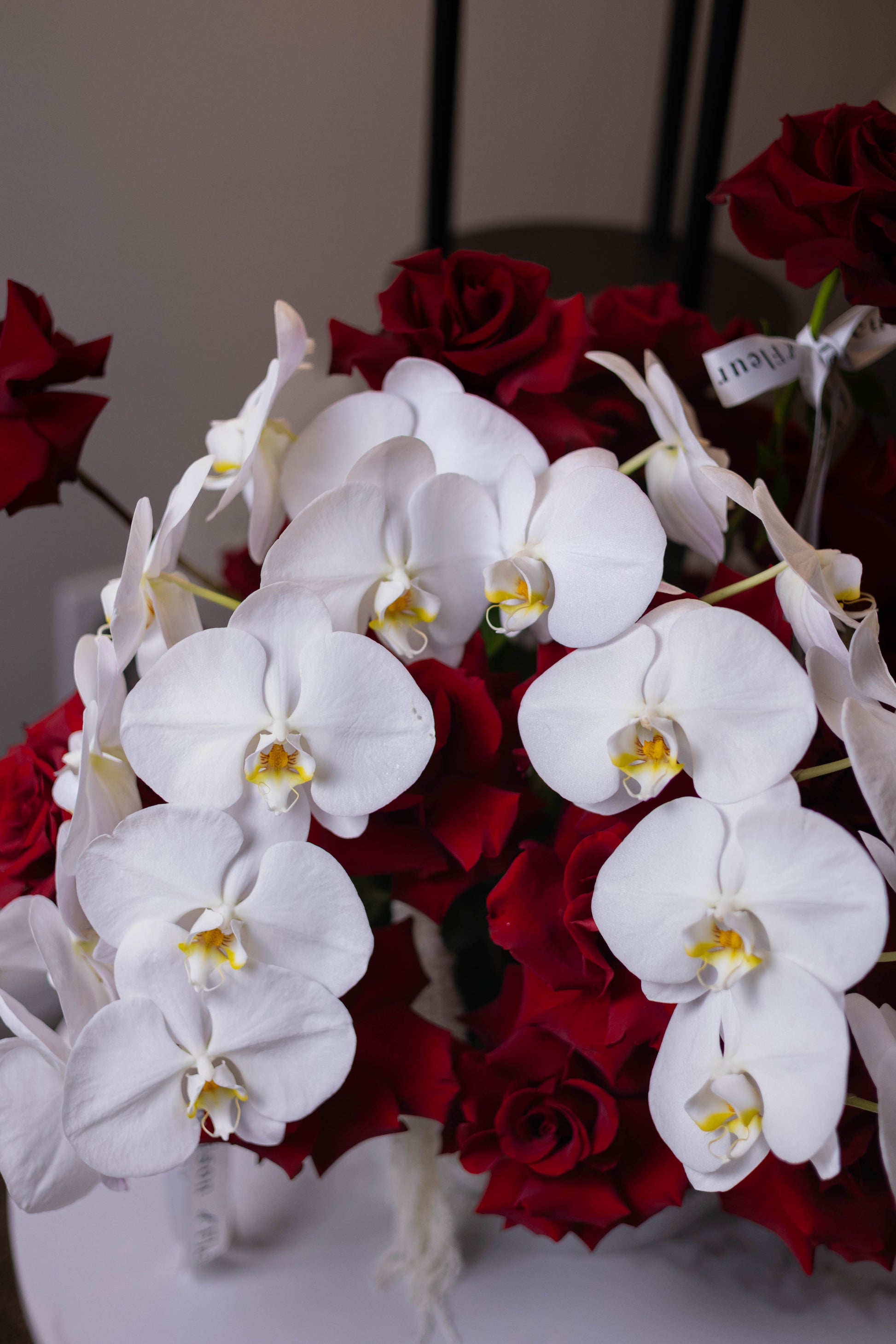 Details: premium deep red roses and cascading white orchids, arranged in our signature round box with elegant ribbon accents