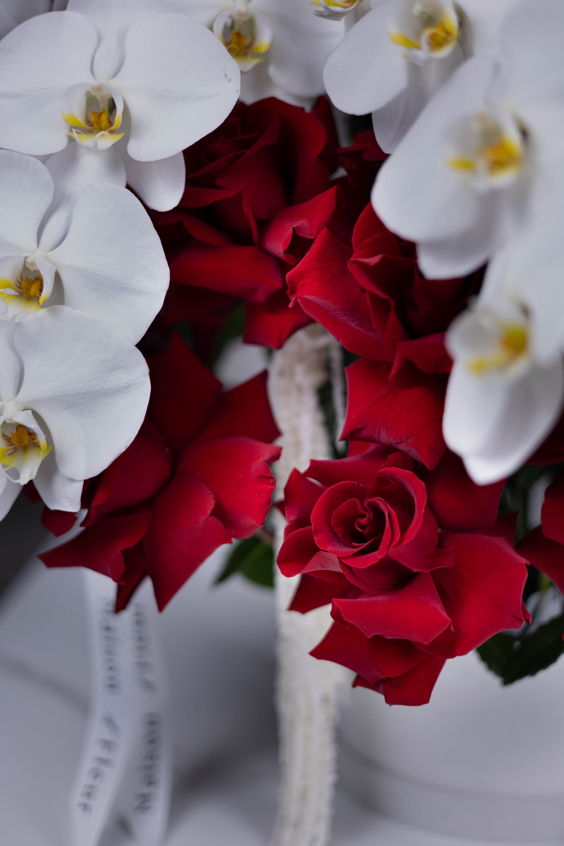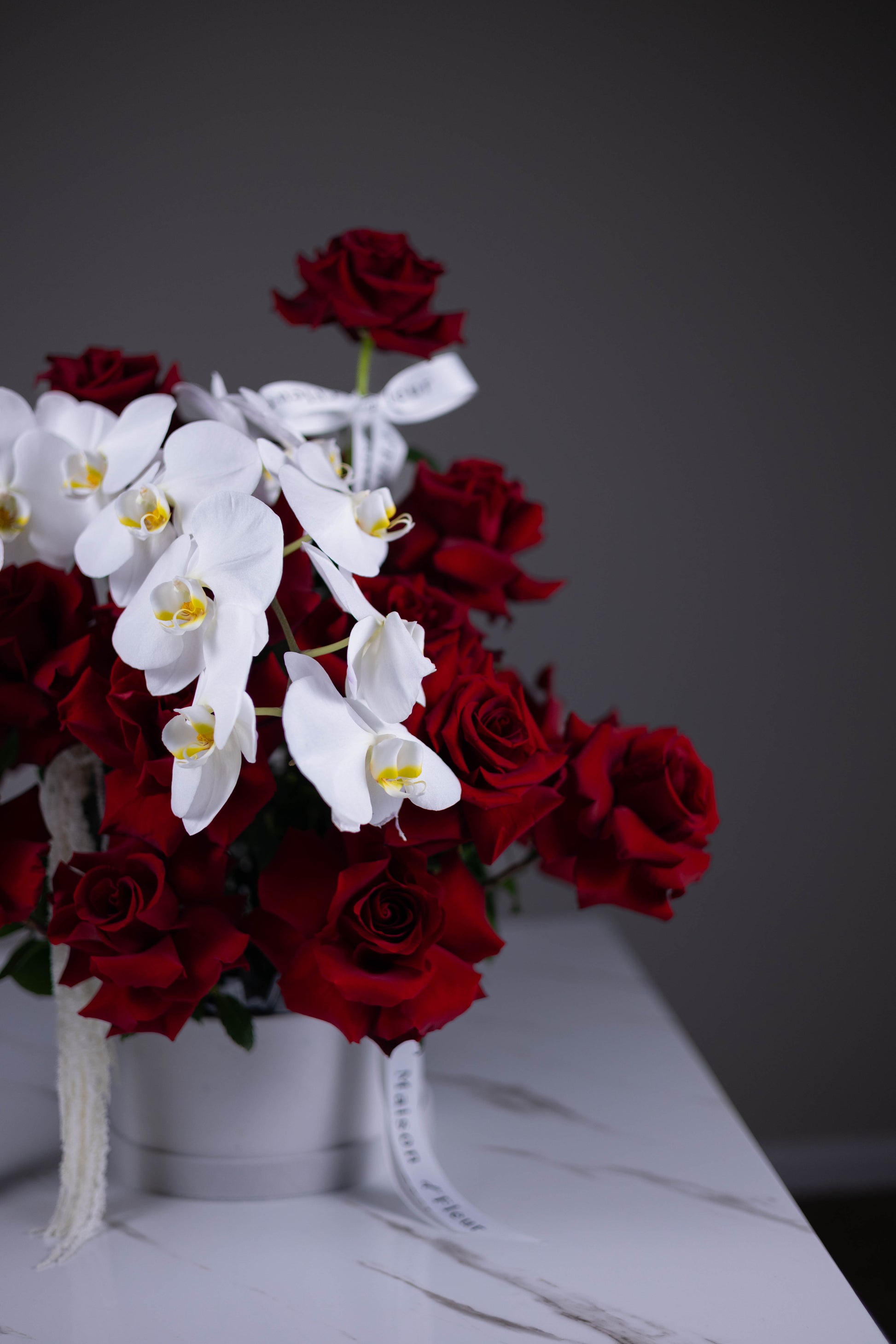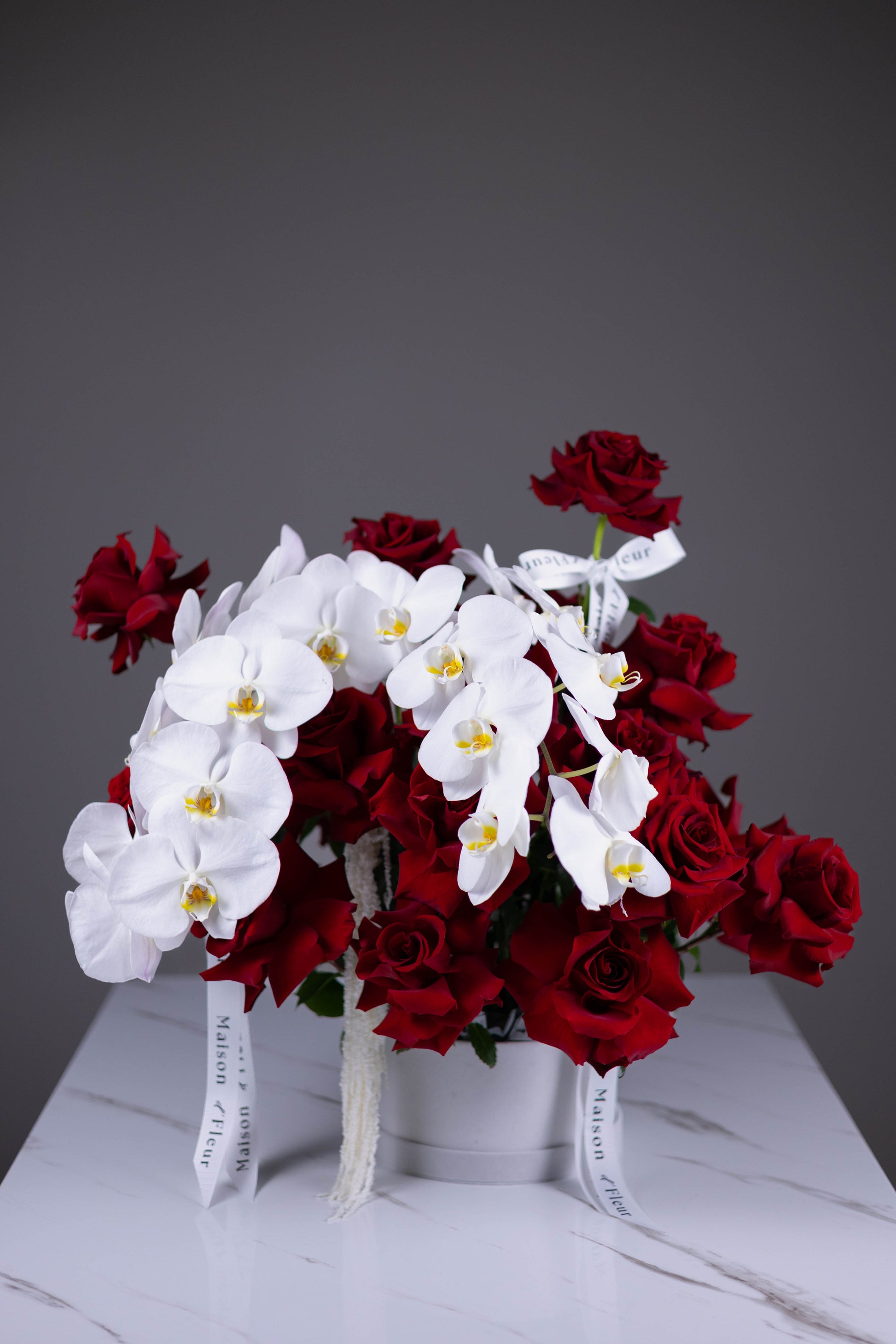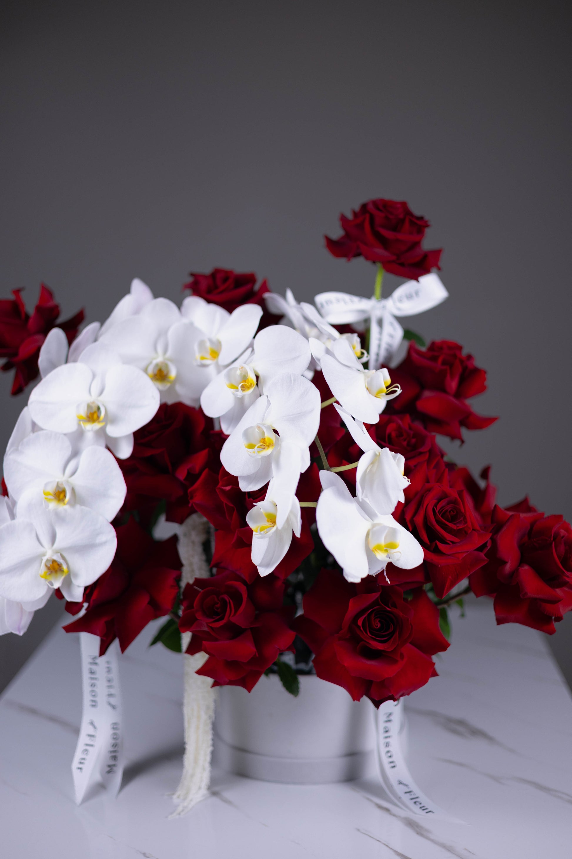 Details: premium deep red roses and cascading white orchids, arranged in our signature round box with elegant ribbon accents
