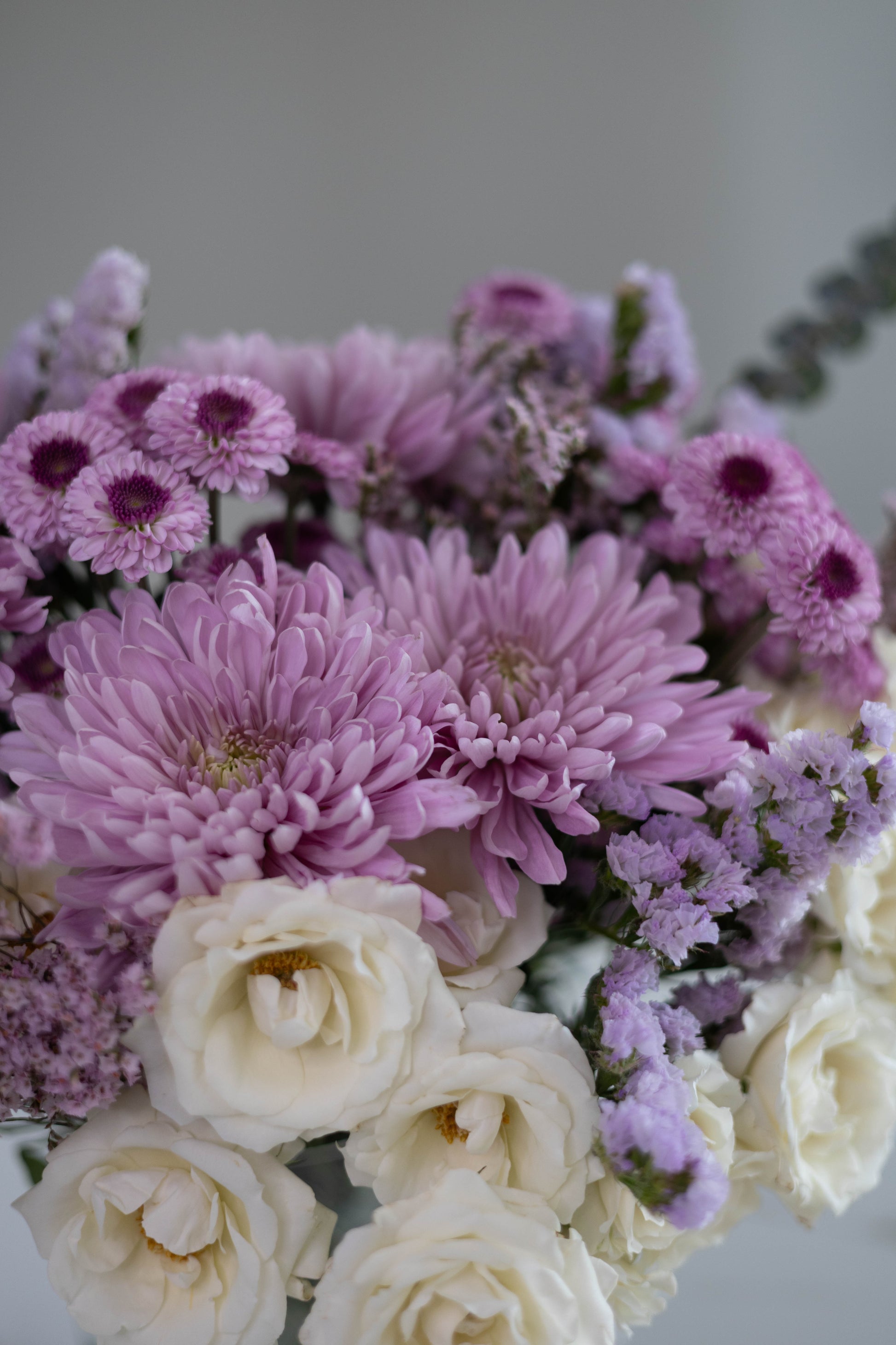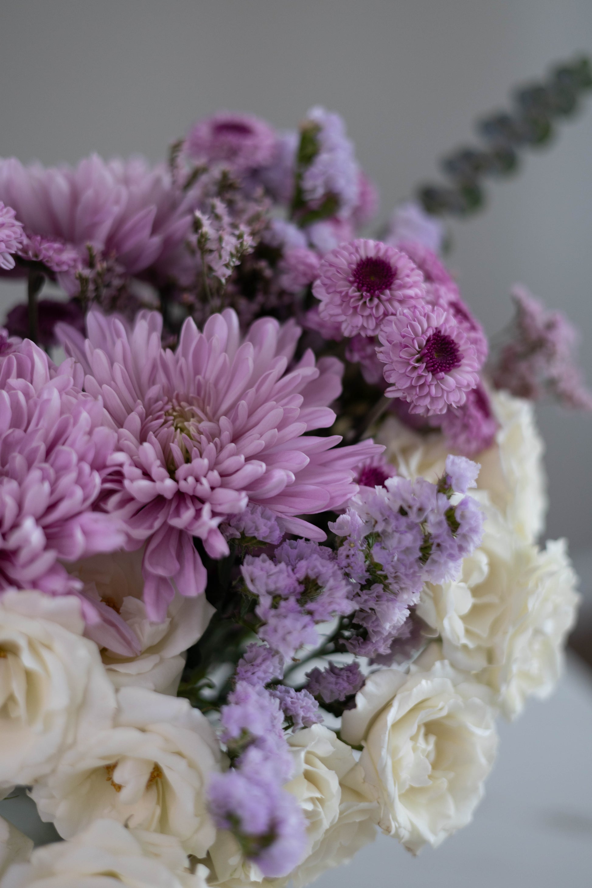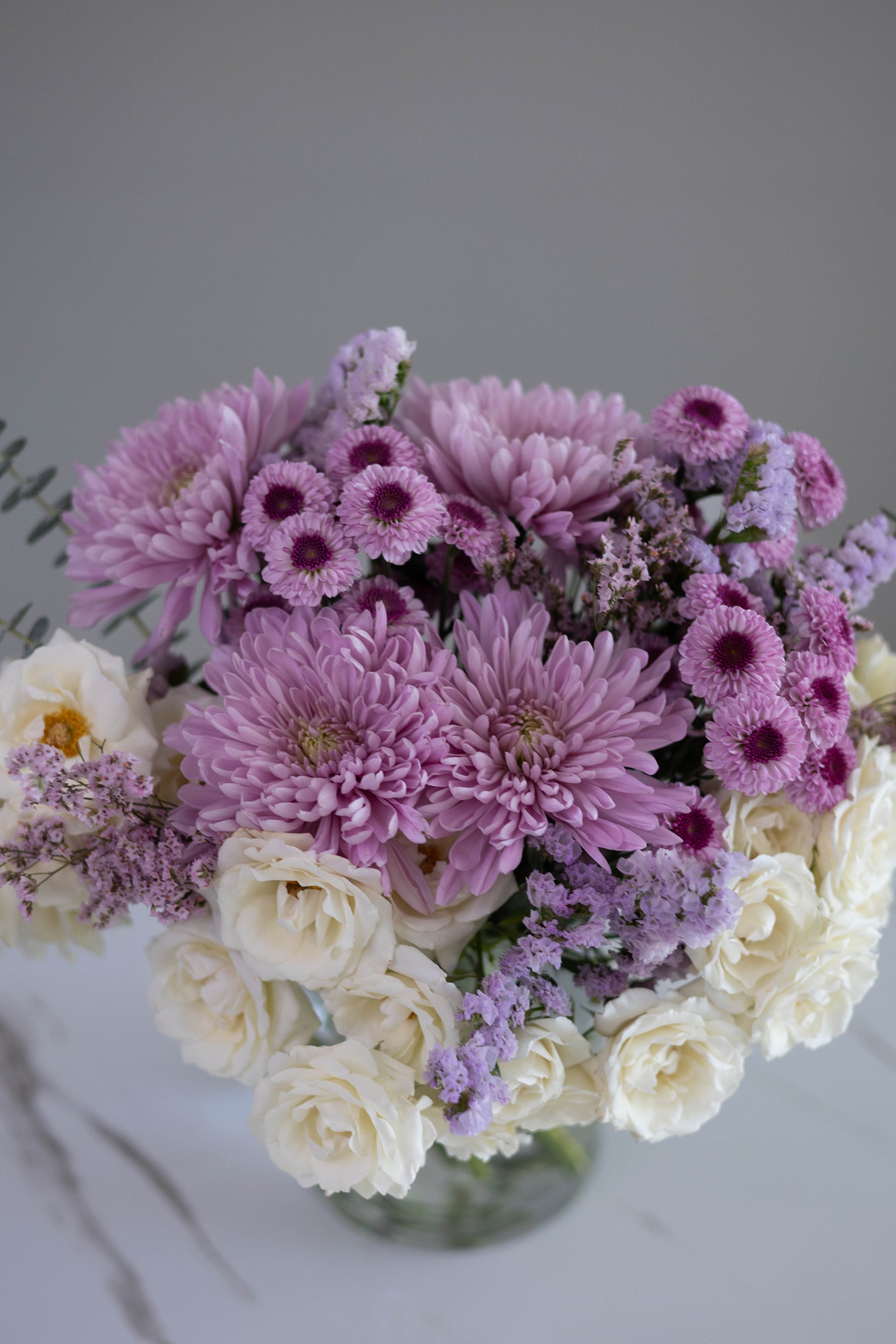 Immerse yourself in the enchanting hues of "Poetic Charm", a delicate blend of creamy white spray roses, soft lavender chrysanthemums, and dainty statice flowers. Accented with eucalyptus for a hint of freshness, this arrangement captures a sense of serenity and grace. Arranged in a modern glass vase, it is a refined statement piece, perfect for adding elegance to any space.