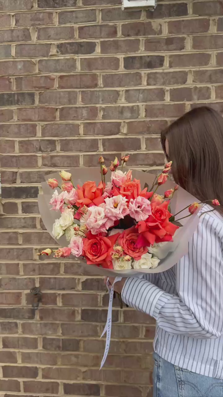Bursting with painterly charm, Soleil d’Artiste is a bouquet that channels the bold spirit of a midsummer muse. Vibrant orange roses command attention, softened by delicate lisianthus and creamy white spray roses. Each stem is thoughtfully placed, creating a canvas of color that feels both spirited and sophisticated.