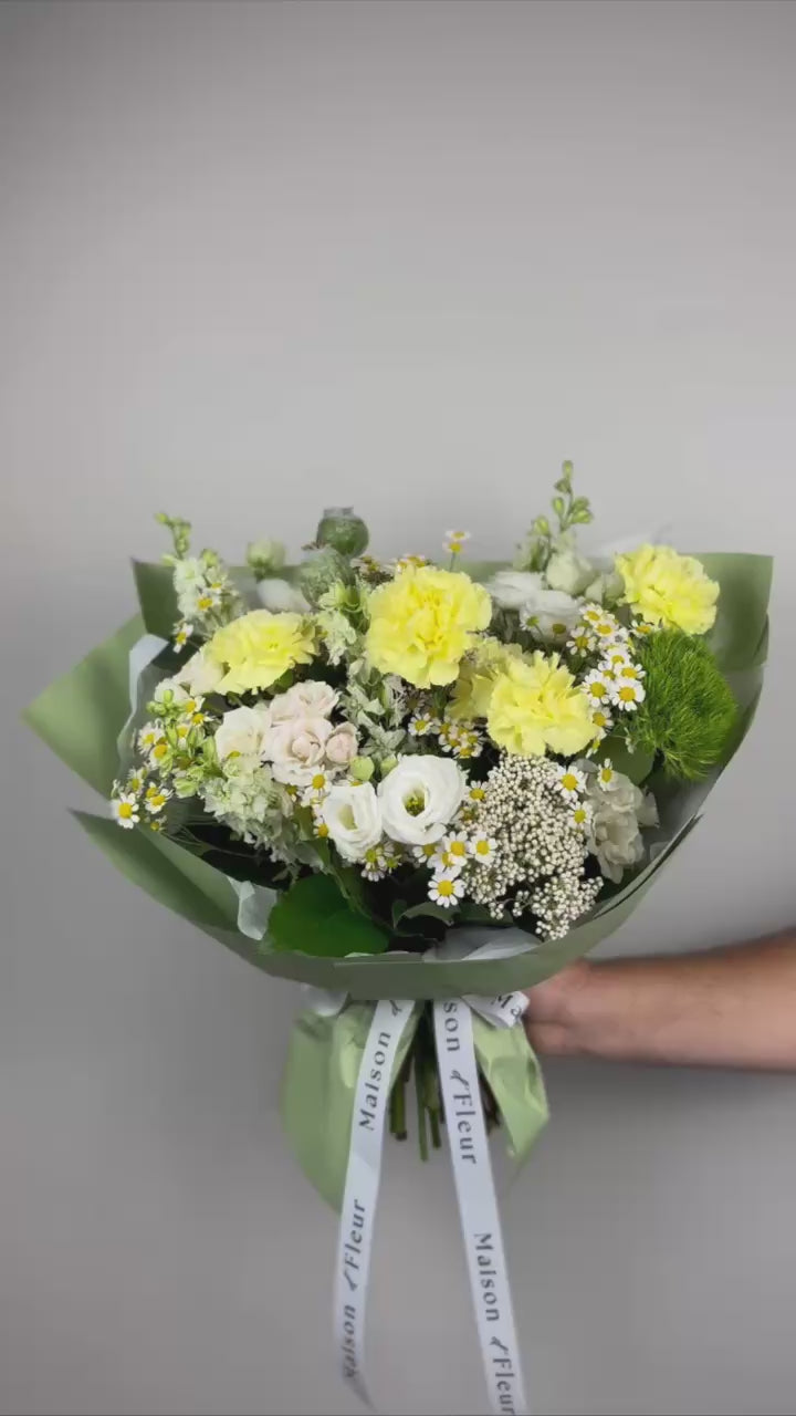 Fresh, cheerful, and full of countryside charm, Verger Matinal is a radiant bouquet inspired by dewy orchards and early summer fields. Bursting with sunny yellow carnations, soft lisianthus, delicate spray roses, and whimsical chamomile, this design is balanced with crisp greenery and textural elements like poppy pods and white rice flower